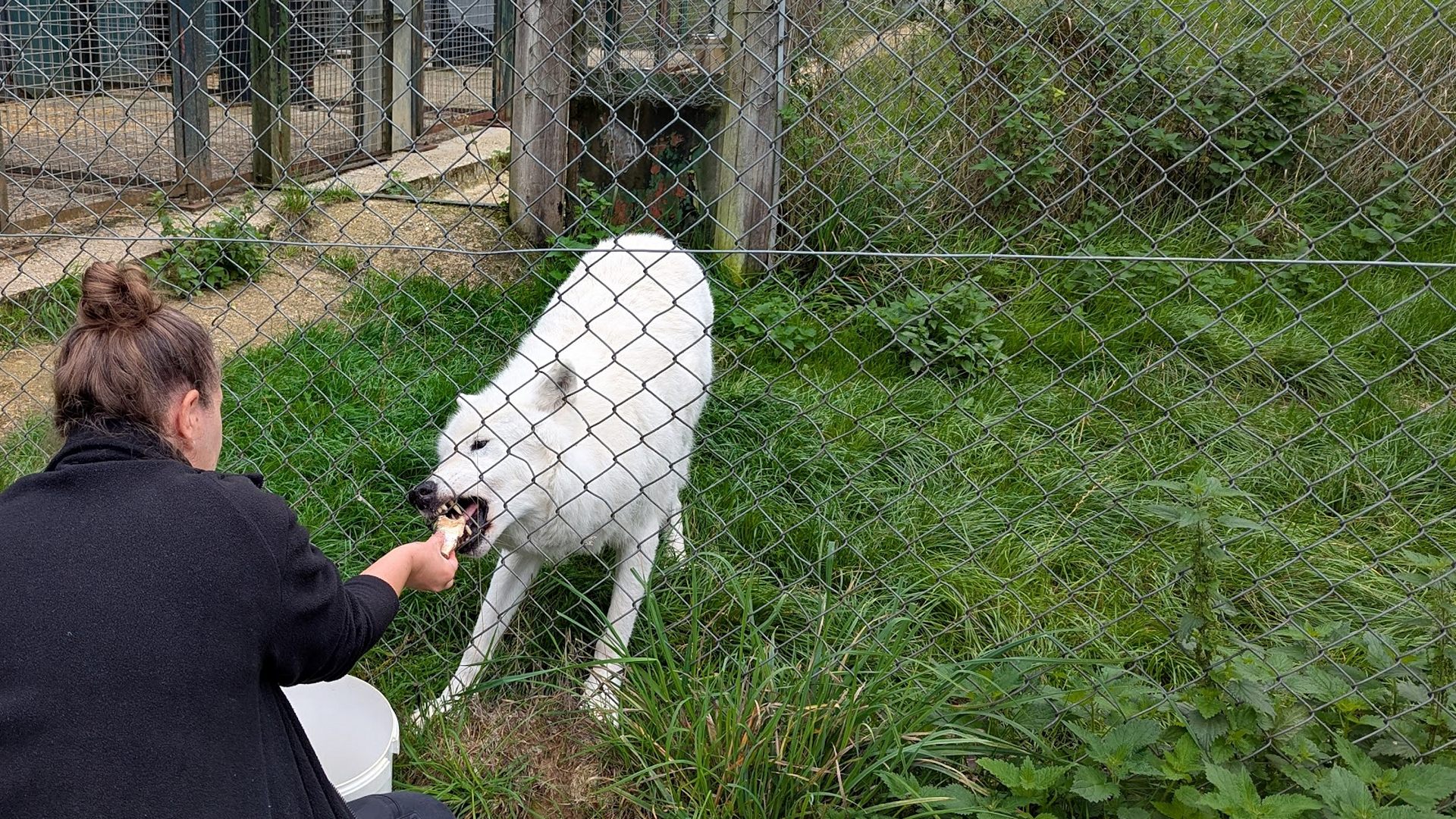 We then went in with the wolves for a bit, with all three Beenhams coming and going, and both Tala and Tundra giving their trademark neck rubs to the volunteers. One of the things we do when we're in the enclosure is examine the wolves for ticks, lumps, etc, and this time Nuka took it as an invitation to play - he suddenly zoomed off at full pelt, galloping off around the mound. It was a reminder of how even coming up to 14 years old, the wolves still have a joie de vivre about them.