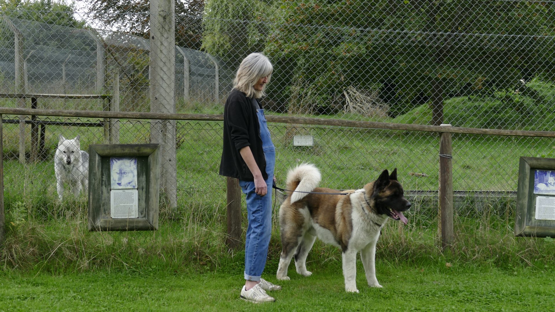 The days at the Trust are shorter now, as we're down to four wolves, but the overall pattern is similar. One big change is that the Beenhams don't come out on walks as often - neither Tala nor Tundra fancied coming out, so instead we went in with them for a while. They've become a bit more wary now that Nuka is no longer part of their pack. The Arctics still come up to the fence for some fuss and attention, and had plenty of both during the day. Our senior handler for the day brought her American Akita - staying outside the enclosures, of course - and he was a hit with the Beenhams: they were fascinated with him!