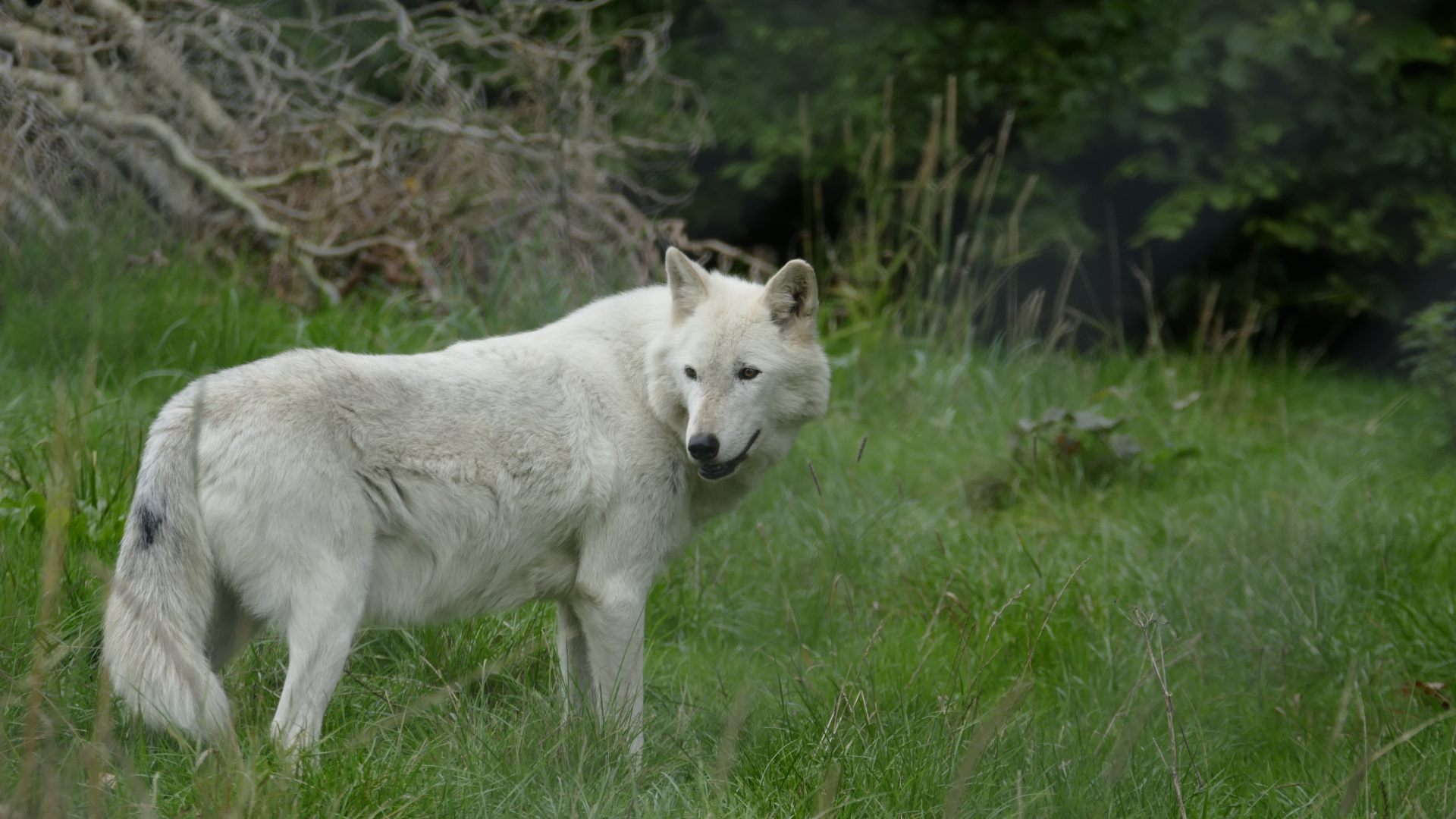 The wolves went into the pond (the water levels being quite high), and again Nuka pawed a bit, sloshing arcs of water into the air. We then meandered around the bottom of the field, the wolves relishing the various new smells since the last time they were out. They were all very relaxed, and it was a far cry from the old days where the wolves became a bit tense due to the breeding season.